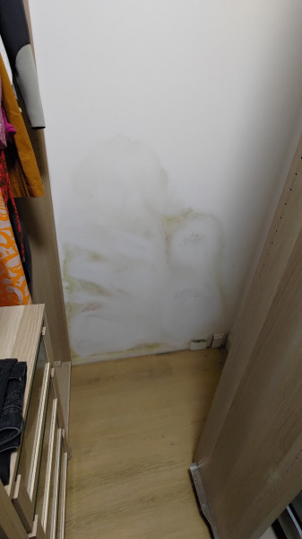 Leider war der Raum so klein, dass wir nicht viel Platz zum Fotografieren hatten. Dennoch gibt es hier einen kleinen Einblick, wie wir das Problem innerhalb eines Tages lösen können. Wir haben die Schränke abgebaut, die Wand getrocknet, eine Grundierung und eine Isolierbeschichtung aufgetragen – und das Problem ist gelöst.