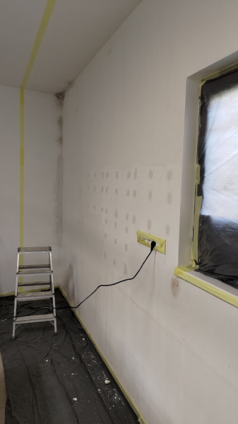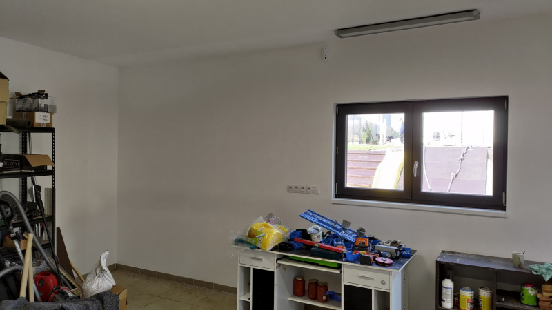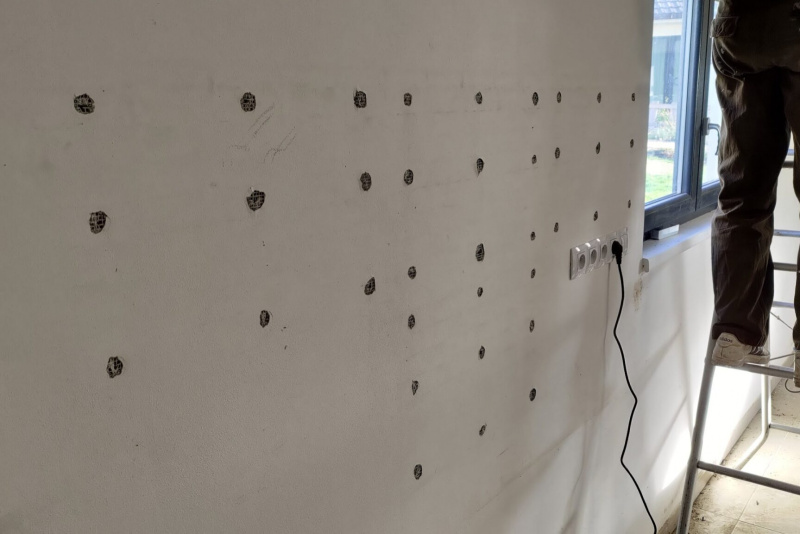 Die Garage wurde unterhalb des Geländeniveaus gebaut und innen rundum mit herkömmlichem Material gedämmt. Trotzdem ist die Garage sehr kalt, die Wände sind beschlagen und in den Ecken bildet sich Schimmel. Die Rückwand der Garage war am stärksten betroffen, also haben wir uns daran gemacht! Zuerst wurden die Löcher repariert, dann haben wir die Wand imprägniert und eine wärmedämmende Beschichtung aufgetragen.