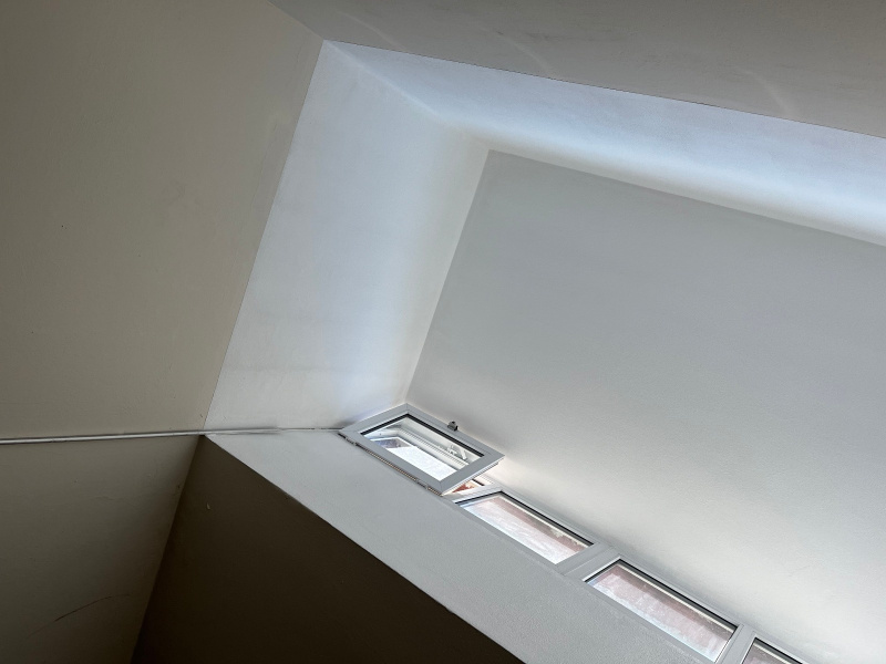 Mit einer Wärmebildkamera untersuchten wir das Problem und fanden eine versteckte Wärmebrücke, die dafür verantwortlich war. Anschließend verwendeten wir unsere speziellen Isolierbeschichtungen, um sicherzustellen, dass das Problem nicht wieder auftritt. Obwohl wir es mit hohen Decken zu tun hatten, hinderte uns die Höhe keineswegs daran, erfolgreich zu sein!